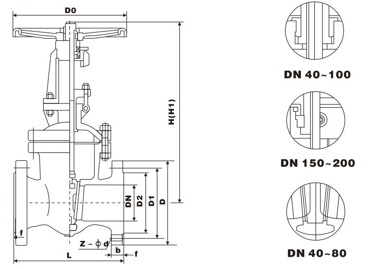 四、Z41W美標閘閥主要外形及連接尺寸: